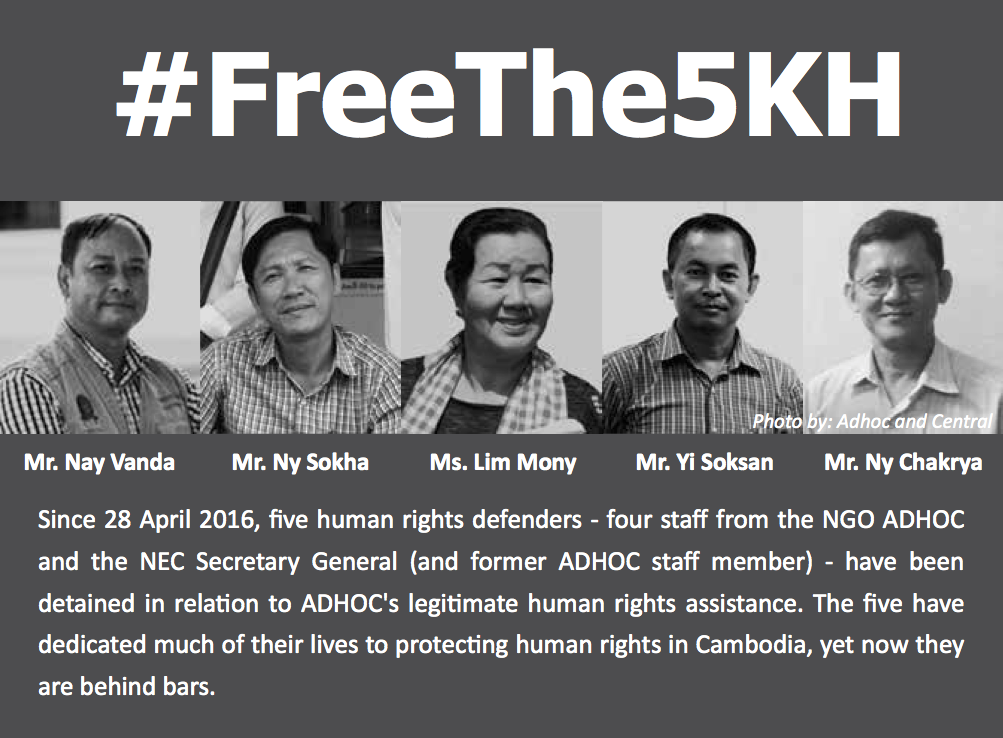 The #FreeThe5KH campaign aims to garner support for the five detained human rights defenders, to remind them that the public has not forgotten about their cause and to help keep their morale high while they remain in detention.